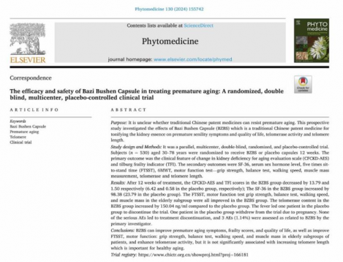 除了慢性炎症相关研究,八子补肾发表在国际权威期刊《Phytomedicine》(植物医学)的一篇论文指出,由中国中医科学院团队主导的“八子补肾”随机双盲对照试验显示,服用八子补肾3个月后,不仅毛发、握力、精神等生理指标得到显著改善,而且端粒酶活性提高了76.7%。(生物学界普遍认为,端粒酶活性越高,越年轻。)